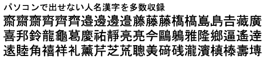 こちらからご確認ください。 http://www.est.co.jp/font/jinmei1500v5/shuroku/ 注意)上記URLは、パッケージ製品のサイトで楷書体の表記ですが、収録外字数および外字の割り付けは本書体と同じです。 |