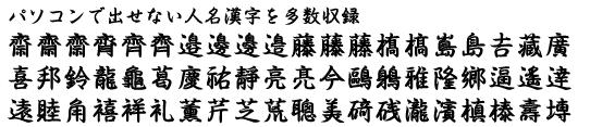 こちらからご確認ください。 http://www.est.co.jp/font/jinmei1500v5/shuroku/ 注意)上記URLは、パッケージ製品のサイトで楷書体の表記ですが、収録外字数および外字の割り付けは本書体と同じです。 |