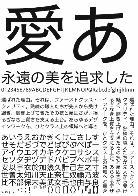 ヒラギノ角ゴAD仮名に誤読防止のデザイン処理を加え、ヒラギノ角ゴの漢字とヒラギノUD角ゴの欧文を組み合わせた書体。“Flat”“Fine”を意味する「F」のネーミングが表すとおり、漢字と仮名の字面をほぼ一定にそろえ、均一なラインを生み出し、明るくすっきり見せることを重視。サインデザインから組み込みに至るまで多様な用途に対応。