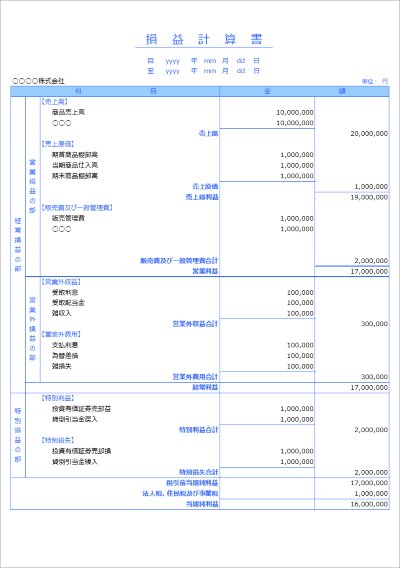 決算報告書の主要書類である財務諸表のひとつ、損益計算書(PL)テンプレートです。