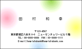 ピンク・グリーン・イエロー・ブルーのふんわりしたまゆ玉のようなドットが描かれています。明るくはずむような楽しさとバランス感を兼ね備え、好感度の高いデザインです。 氏名、住所、TEL、FAX、Eメールアドレスの項目が設定されています。項目の追加やロゴなど画像の追加など、編集も可能です。