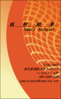 どことなく果物のオレンジを連想させる背景画像の名刺テンプレート。果物農家のあなた、果物好きのあなたにおすすめです。縦置き横書き。氏名、英語名、住所、TEL、Eメールアドレスの項目が設定されています。項目の追加やロゴなど画像の追加など、編集も可能です。