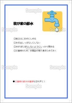 家庭用の節水チェックリストです。蛇口はこまめに閉める、水を出しっぱなしにしない、などのチェック項目を記載しています。ご家庭で台所や洗面所に貼るのにちょうどいいA5サイズです。