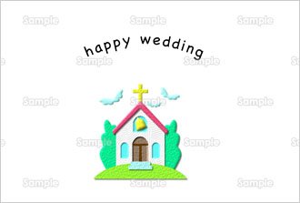 教会が描かれた結婚祝いカード。教会の周りには木立が茂り、空には水色の鳥が飛び祝福します。タイトルメッセージは英語で「happy wedding」。空いたスペースに相手へのメッセージを入力して、結婚のお祝いにお渡しください。はがきサイズと名刺サイズのミニカードが作れます。