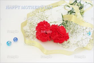 赤いカーネーションと白いかすみ草の写真の、母の日用グリーティングカード。薄い黄色のりぼんと青いビー玉がアクセントになってます。タイトルメッセージは「HAPPY MOTHERS DAY」。お母さんへの感謝の気持ちをメッセージにしてお渡しください。はがきサイズと名刺サイズのミニカードが作れます。