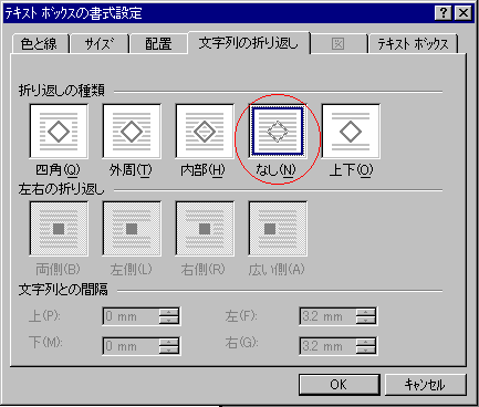 Word 2000以上の場合は、[図の書式設定]ダイアログボックスで[レイアウト]タブをクリックし、[折り返しの種類と配置]を「前面」に設定し、[OK]ボタンをクリックします。