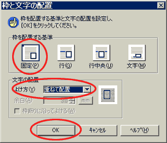 レイアウト枠をクリックして、■で囲まれた状態にし、メニューバーの[絵や枠]−[枠と文字の配置]を選びます。