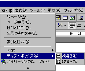 | (1) | メニューバーの[挿入]−[テキストボックス]から[横書き]または[縦書き]を選び、文字を入力したい所でドラッグすると、テキストボックスが作られます。