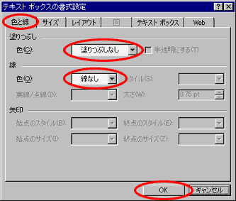 テキストボックスに枠や色が着いている場合は、(2)と同じことをして、[テキストボックスの書式設定]ダイアログボックスを開きます。 [色と線]タブをクリックし、[塗りつぶし]の[色]を「塗りつぶしなし」に、[線]の[色]を「線なし」にして、[OK]ボタンをクリックします。 |
